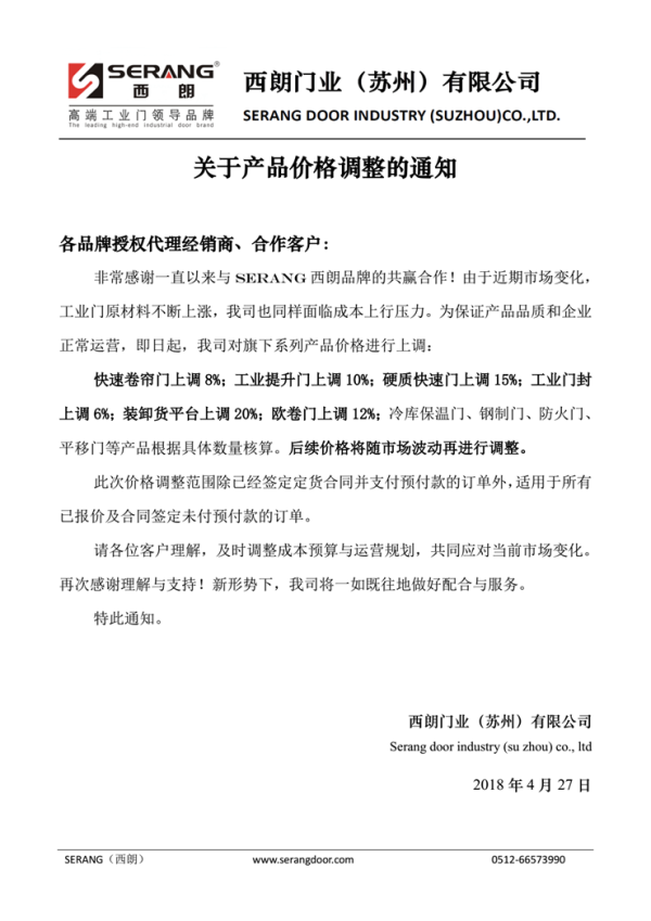 非常感謝一直以來與SERANG西朗品牌的共贏合作!由于近期市場變化,工業門原材料不斷上漲,我司也同樣面臨成本上行壓力。為保證產品品質和企業正常運營,即日起,我司對旗下系列產品價格進行上調: