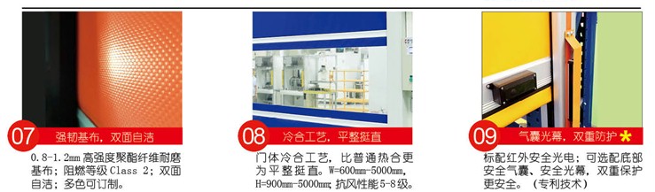 A系列蘇州快速門是第五代新型快速門,采用國際領先技術標準的Abundant III集成式高智能控制系統,創新的可視化人機界面設計,實現人機實時交流,中英文顯示對話界面服務內外資企業使用。獨創將工業美學概念引入框架結構設計中,結合激光構件精密制造,體現結構設計頂級水準。確保常年無故障運行15萬次以上,日均1000次左右。